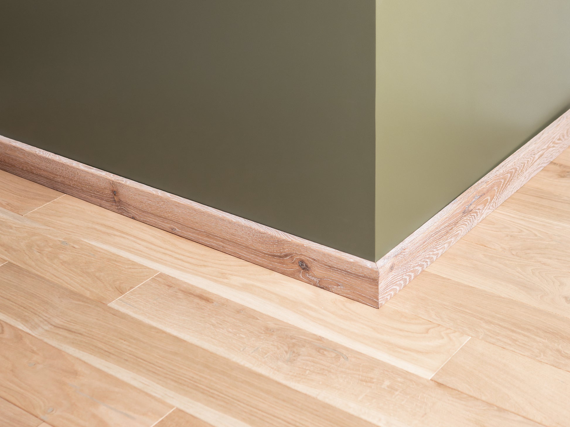 Plinthe en chêne massif rustique, 18 x 70 x 2000 mm, avec bord arrondi, huile blanche, remplie, brossée