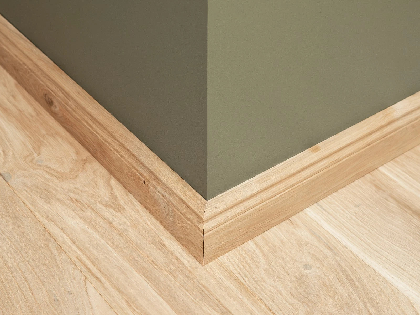 Crafted from premium solid oak in rustic grade, our skirting board is a refined finishing element for any interior, adding warmth, depth, and continuity to your space. The natural oak surface features beautifully expressive knots, subtle cracks, and vibrant grain patterns that celebrate the authentic character of the wood.