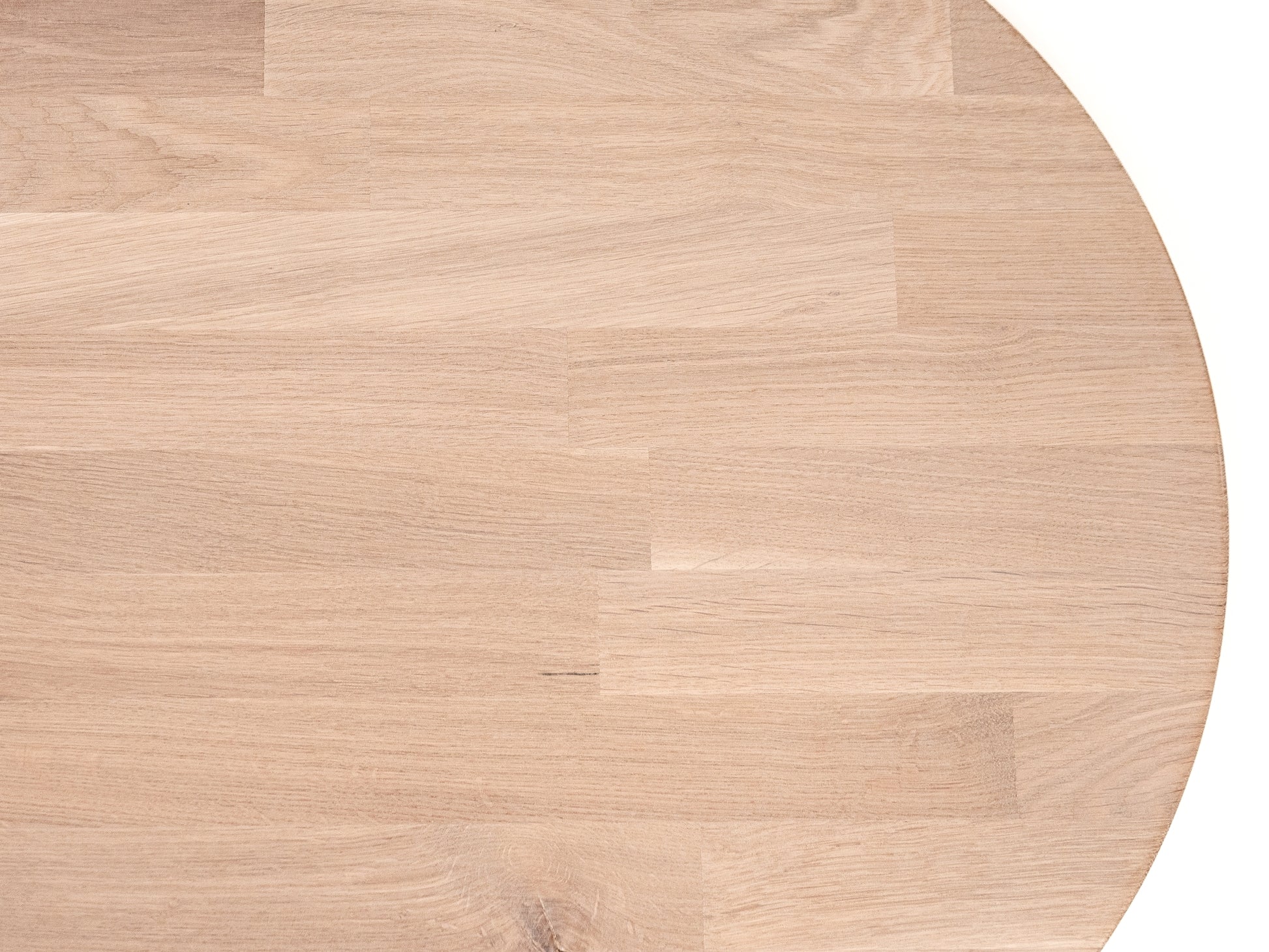 The round tabletop is made from glued solid wood with finger-jointed lamellas – a stable, shape-retaining, and cost-efficient construction. This technique guarantees a smooth surface and reduces the risk of warping.