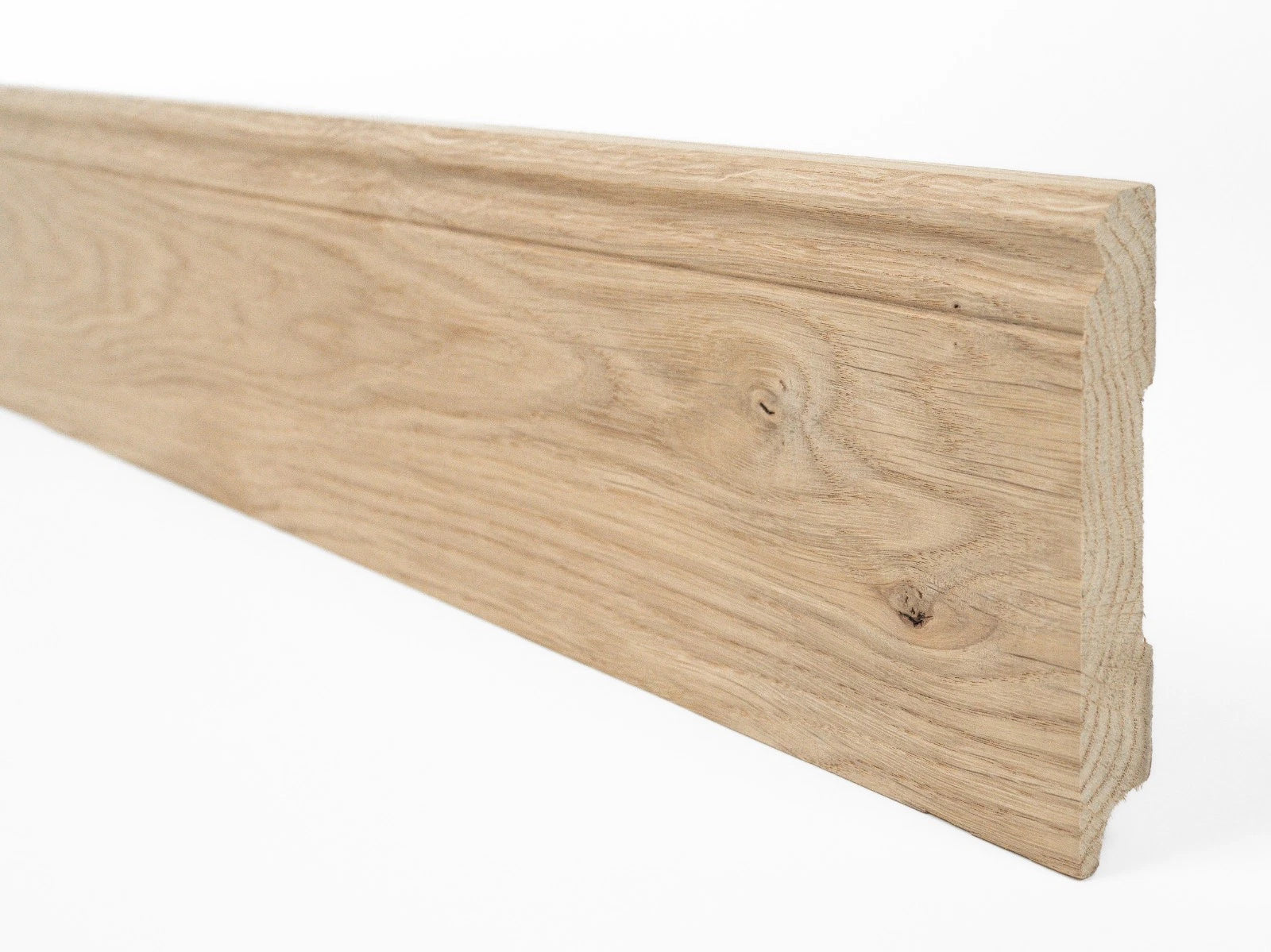 Crafted from premium solid oak in rustic grade, our skirting board is a refined finishing element for any interior, adding warmth, depth, and continuity to your space. The natural oak surface features beautifully expressive knots, subtle cracks, and vibrant grain patterns that celebrate the authentic character of the wood.